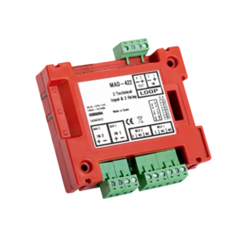 Adresabilni modul za monitor i upravljanje sa 2 nadzirana tehnička ulaza, za signalizaciju statusa uređaja koji omogućavaju NC ili NO kontakt i 2 beznaponska relejna izlaza koji omogućavaju dva neresetirajuća C, NO, NC kontakta. Prihvata četiri adrese u petlji. Napaja se direktno iz petlje. LED indikator statusa. Povezivanje preko izmjenjivih traka do presjeka 2,5 mm2. Mogućnost ugradnje na DIN šinu ili montaže na zid u kutiji BOX-ONE. Potrošnja manja od 300µA u mirovanju. Instalacija bez polariteta. Crvena boja. Dimenzije: 100 x 82 x 23 mm. CPR certifikat EN54-18.